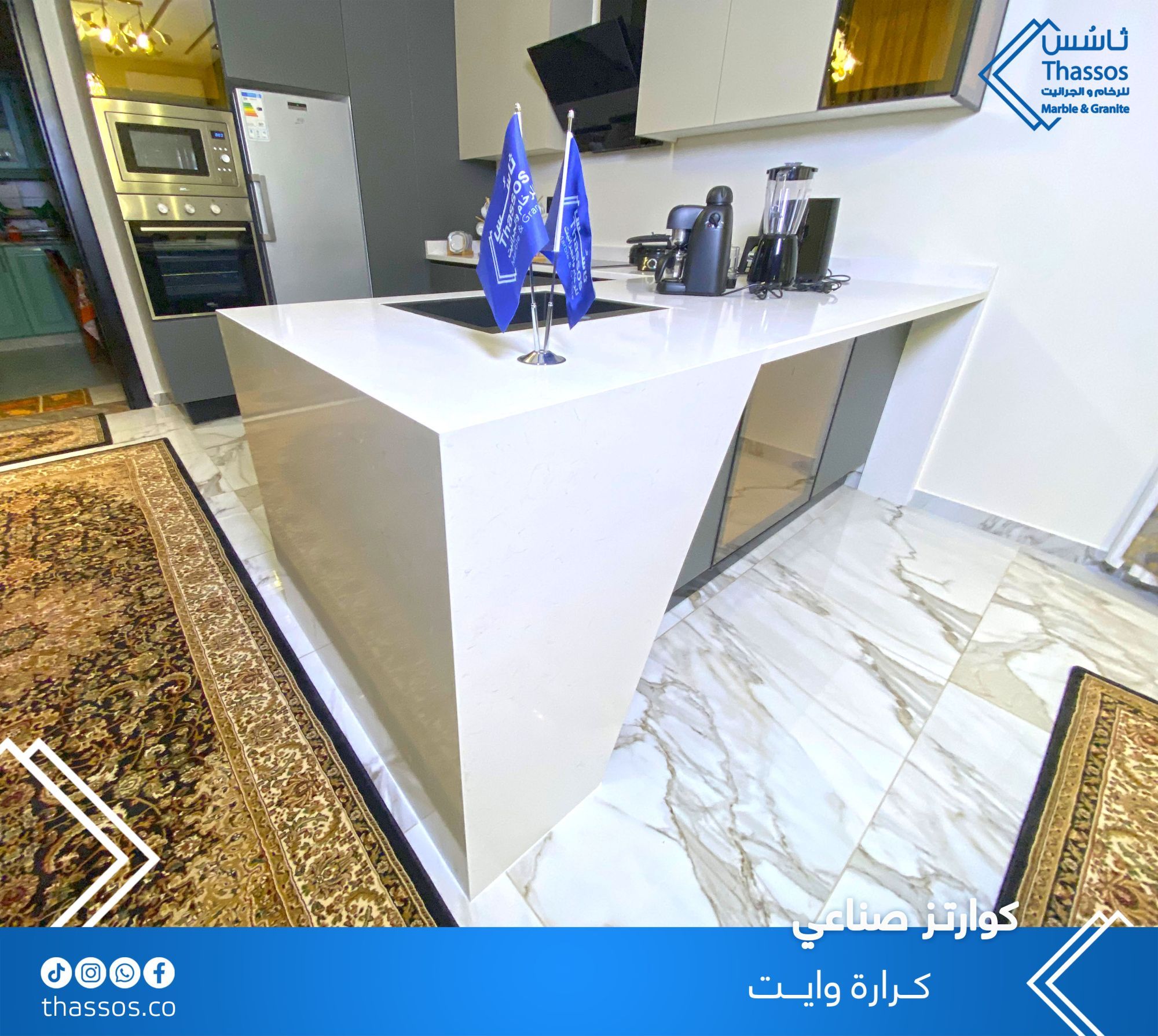 Thassos Marble and Granite Company always presents the most exquisite artistic panels that turn every corner into a complete work of art. This type is distinguished by a white background with light gray veins, adding a touch of calmness and luxury at the same time. With each glance, you can feel the beauty of the unique design seamlessly blending with any decor, furniture, or other colors. Thanks to professional installation by skilled artisans, this kitchen appeared as a complete piece of art without any discrepancies, reflecting quality and attention to detail. Enjoy an atmosphere of sophistication and comfort in every corner, where dreams turn into reality thanks to Thassos's meticulous touch. We thank our dear client for choosing Thassos Marble and Granite Company.